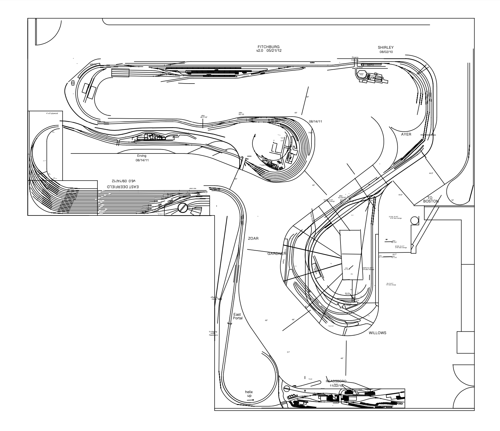 The current layout began its design a few months after we relocated to Phoenix Park in late 2007. Proposals were submitted, comments made, and finally we decided on a plan to model the former Boston and Maine's Fitchburg Division Mainline. This line segment has many iconic scenes that define railroading in New England, from massive river crossings, steep grades and even a 5 mile long tunnel (perfect for concealing a helix!). Our layout design evolved throughout construction, and even now continues to be tweaked.